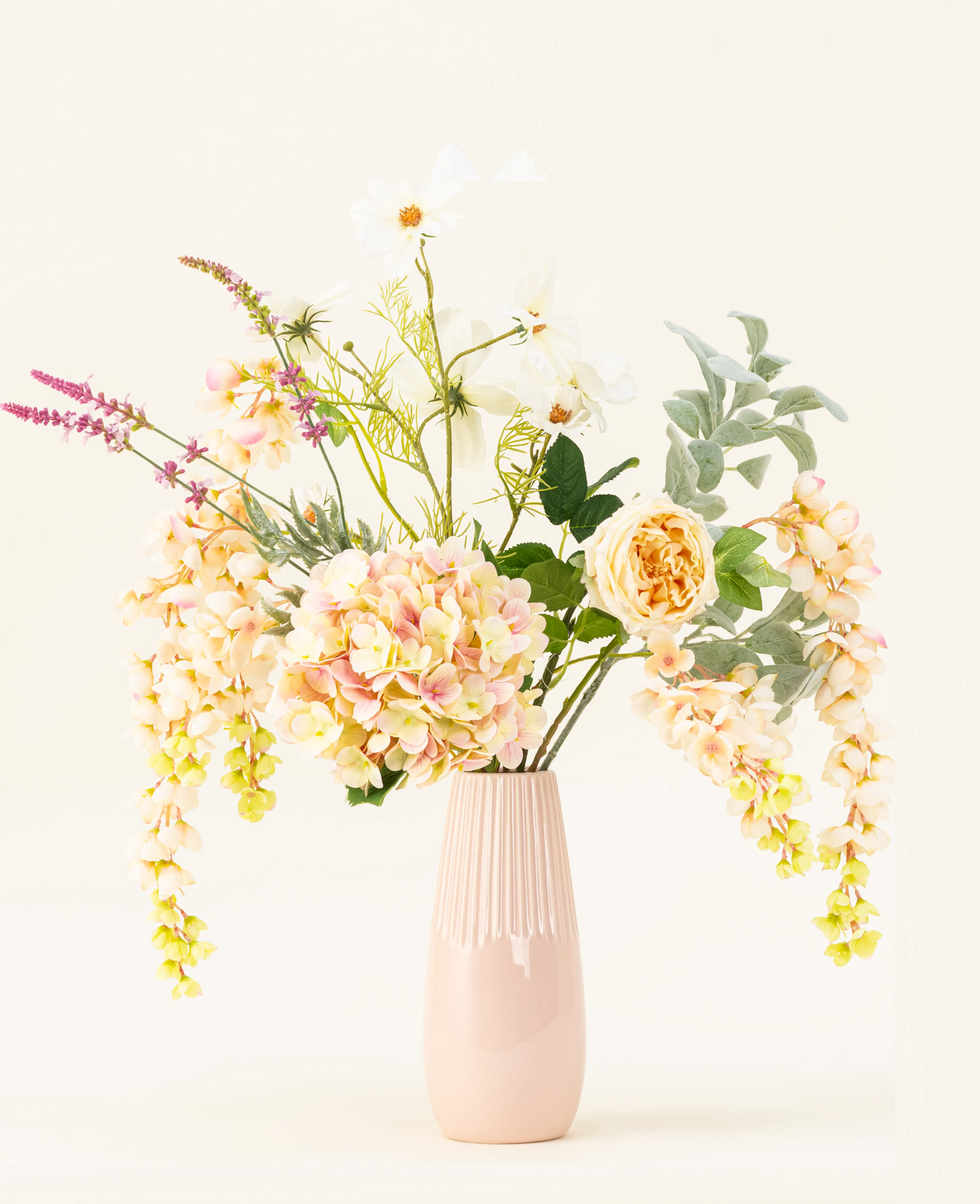 Weich, verträumt und elegant - der Seidenstrauß errötende Schönheit macht seinen Namen all die Ehre. Mit einer luftigen Mischung aus Creme, weißem, weichem Gelb und Lila strahlt dieser Bouquet Romantik und Verfeinerung aus. Ideal für diejenigen, die subtile Luxus und eine leichte, entspannende Atmosphäre im Haus mögen.