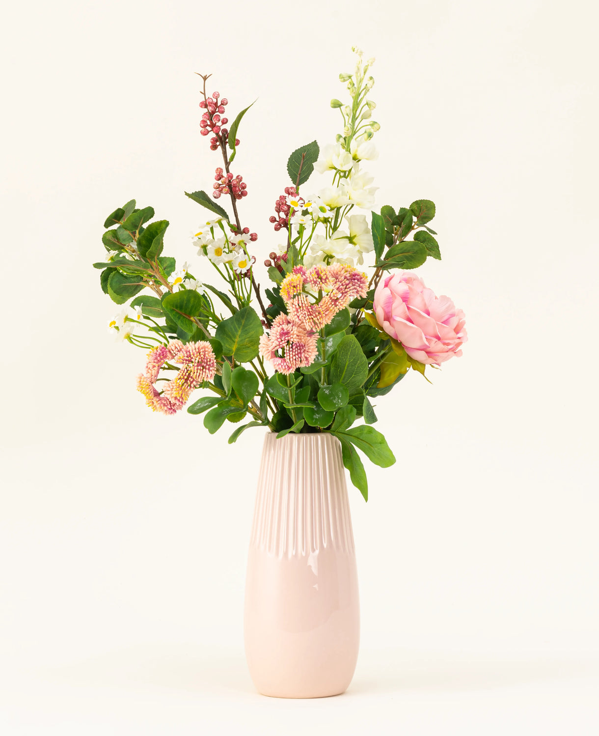 Die weiche Pfingstrose in rosa bildet das romantische Herz des Blumenstraußes, während der Mini -Gänseblümchen in klarem Weiß eine spielerische und fröhliche Note verleiht. Das Delphinium in Weiß liefert luftige Höhe und anmutige Eleganz, während das hellrosa Sedum einen subtilen Akzent und eine subtile Struktur bietet. Die rosa Beeren...