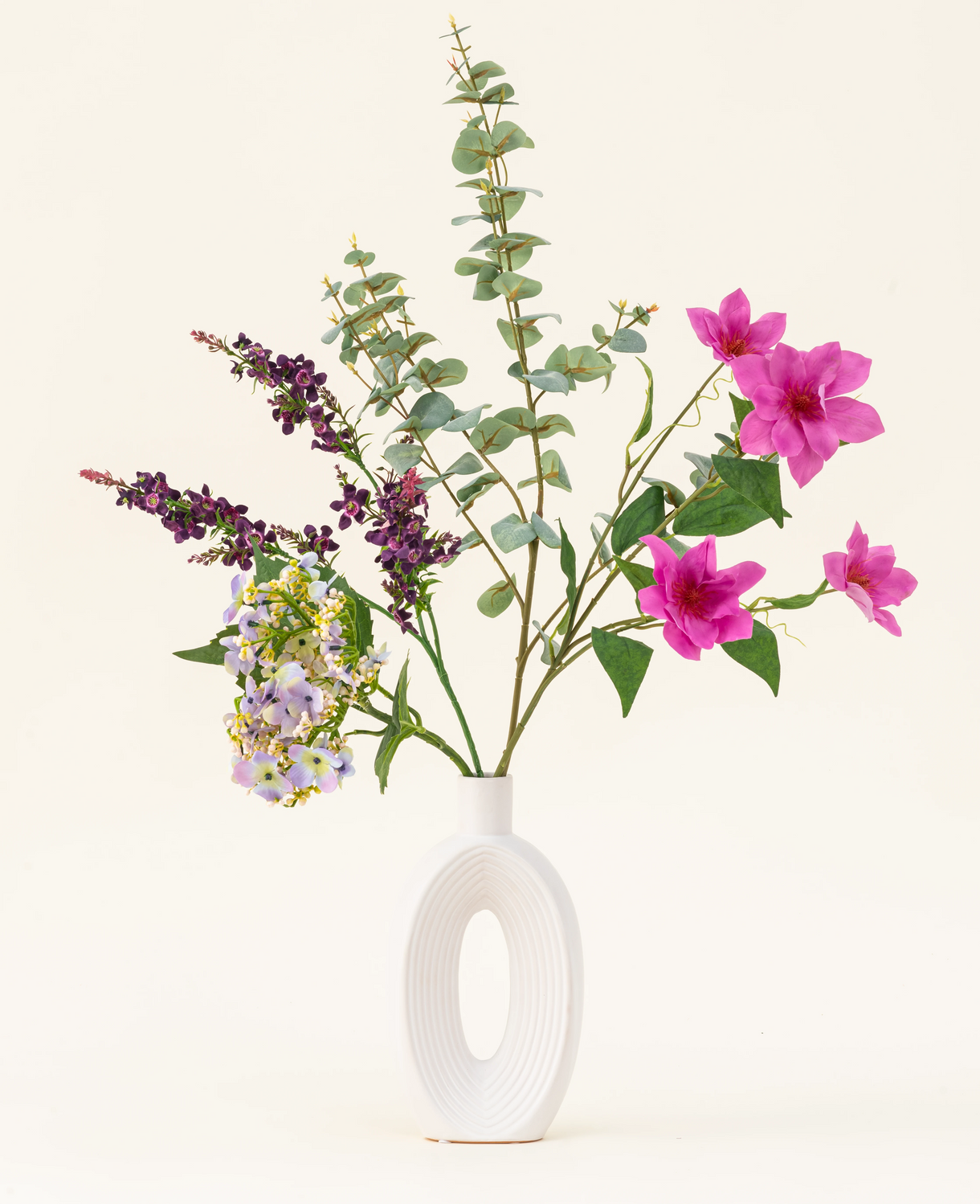 Die Komposition besteht aus lebensechten Blüten mit echtem Touch -Finish, einschließlich der bezaubernden rosa Clematis, einer vollen Pfingstrose, der Verspieltheit von Katzenminenblumen und üppigen Eukalyptuszweigen. Die sorgfältig ausgewählte Mischung aus Strukturen und Farbtönen bringt ein Gefühl der Harmonie, das in dieser Saison nach der Saison weiterhin verzaubert.
