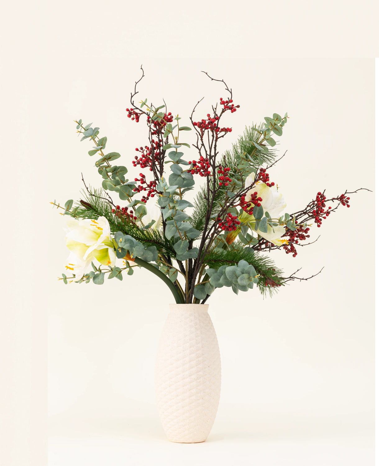 Die weiße Amaryllis ist das ruhige Herzstück und verleiht dem Strauß ein reines, elegantes Aussehen. Die roten Beeren verleihen dem Strauß eine festliche und lebendige Note, während der Kiefernzweig für natürliche Tiefe und eine robuste Basis sorgt. Der Eukalyptus sorgt für Frische und eine moderne grüne Note.